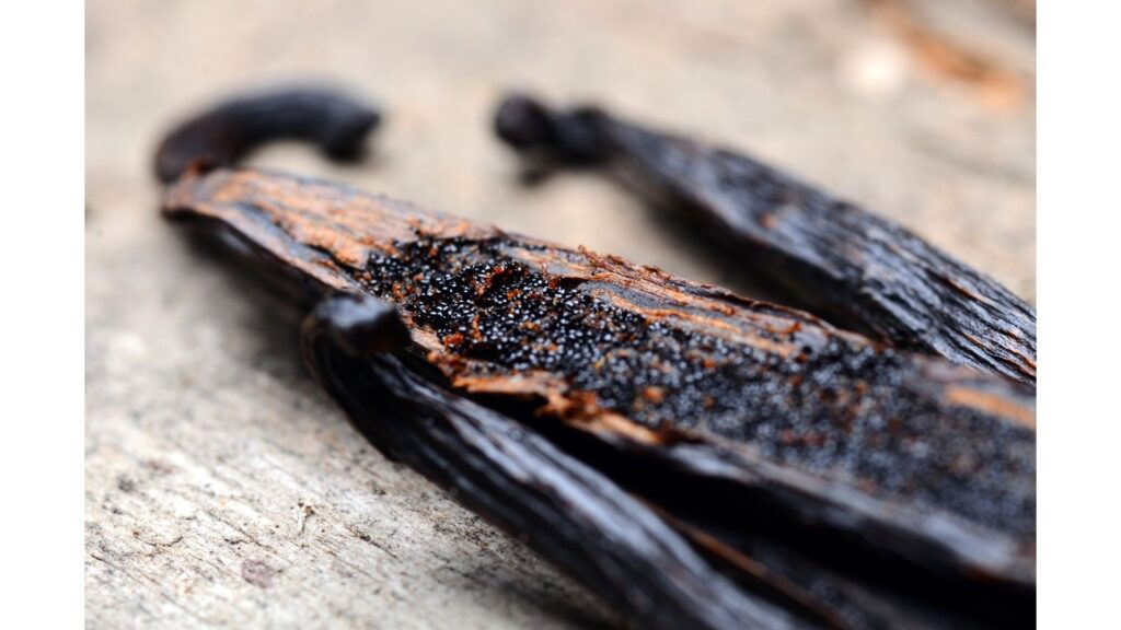 La vanille est issue des gousses de l’orchidée Vanilla planifolia, originaire de Madagascar, reconnue pour son parfum chaud, doux et délicat.